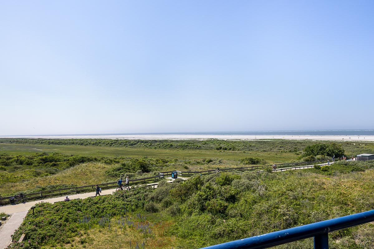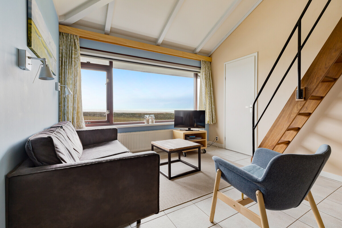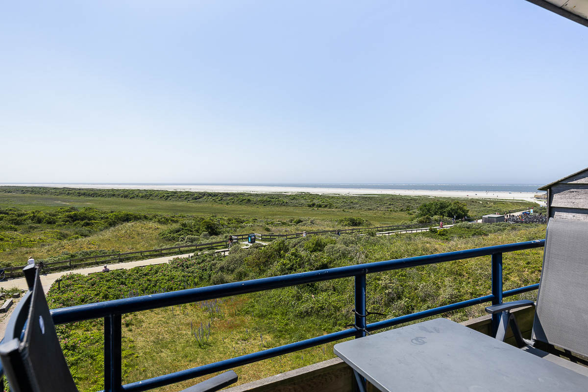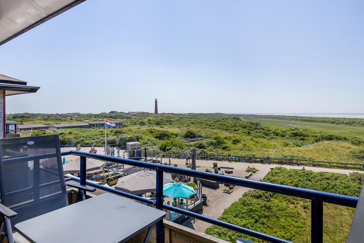 Het balkon ligt op het zonnige zuidwesten. Dat betekent dat je tot de zonsondergang lekker in het zonnetje zit. Je kijkt over de zee en de duinen heen.