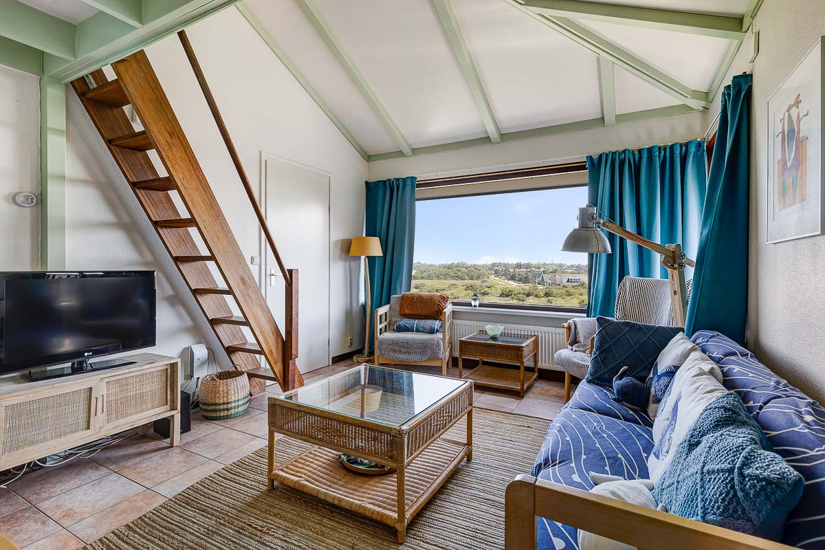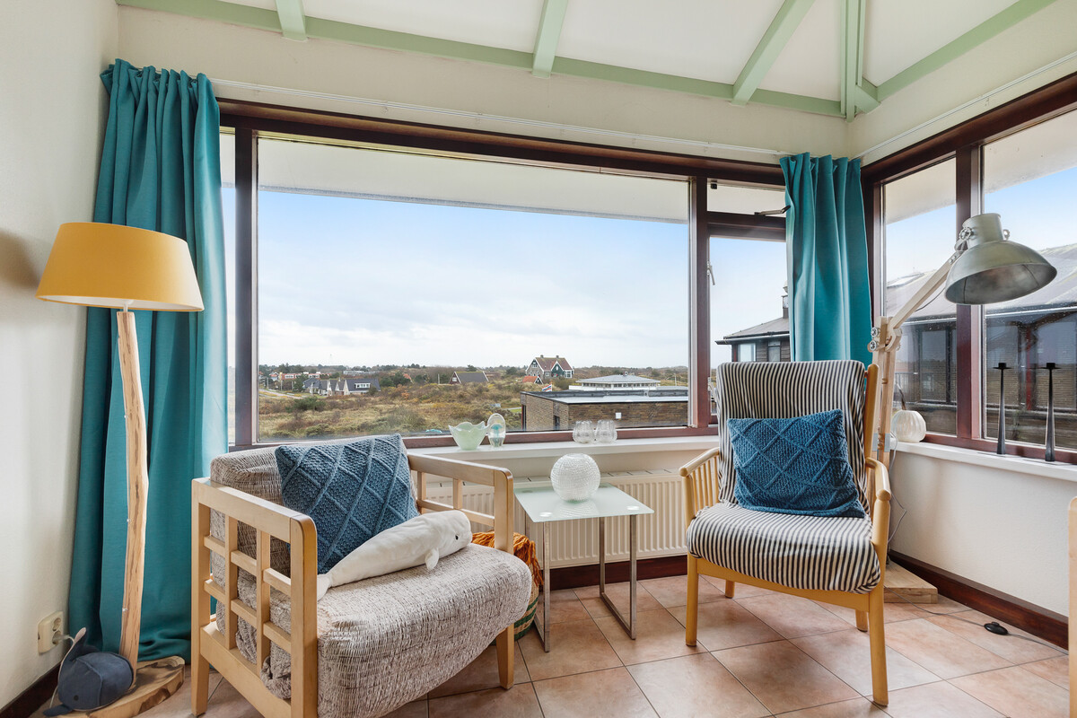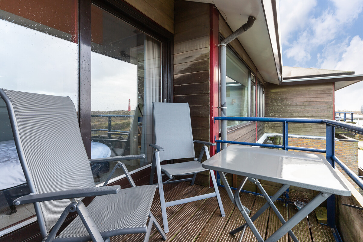 Noderstraun 88 heeft een heerlijk balkon op het zuiden. Je kunt de hele dag lekker in de zon zitten. Doordat je op de bovenste verdieping zit, kijk je vanaf het balkon ver uit over de duinen en het dorp.