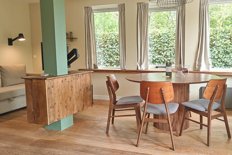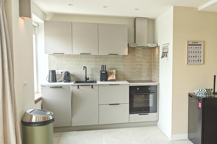 De inrichting van Boszicht 16a ademt het eilandgevoel. Het appartement is volledig gerenoveerd in het voorjaar van 2025. De vloer en muren zijn afgewerkt met natuurlijke materialen. De open keuken is goed uitgerust, ideaal om een lekker ontbijtje of een maaltijd te bereiden.