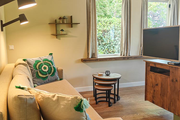Het appartement heeft één slaapkamer met extra lange bedden (210 cm). Kom je met z?n vieren? Dan kun je de bank in de woonkamer uitklappen tot een comfortabele slaapbank. De badkamer is ensuite en voorzien van een ruime regendouche. Er zijn twee aparte toiletten in het appartement.