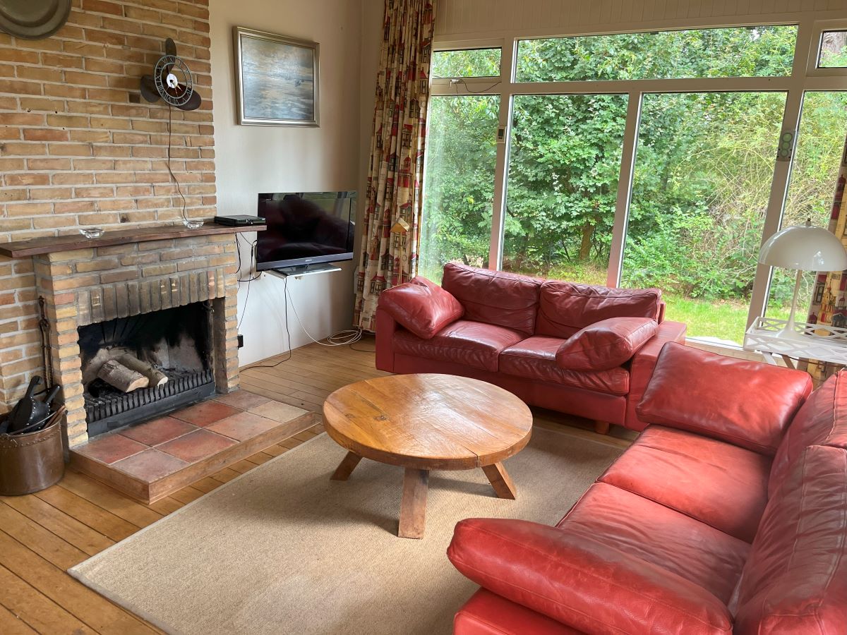 De woonkamer straalt authenticiteit en warmte uit, met een hoog plafond dat de ruimte opent. De grote ramen bieden een prachtig uitzicht op de omliggende natuur en laten het groen naar binnen komen.