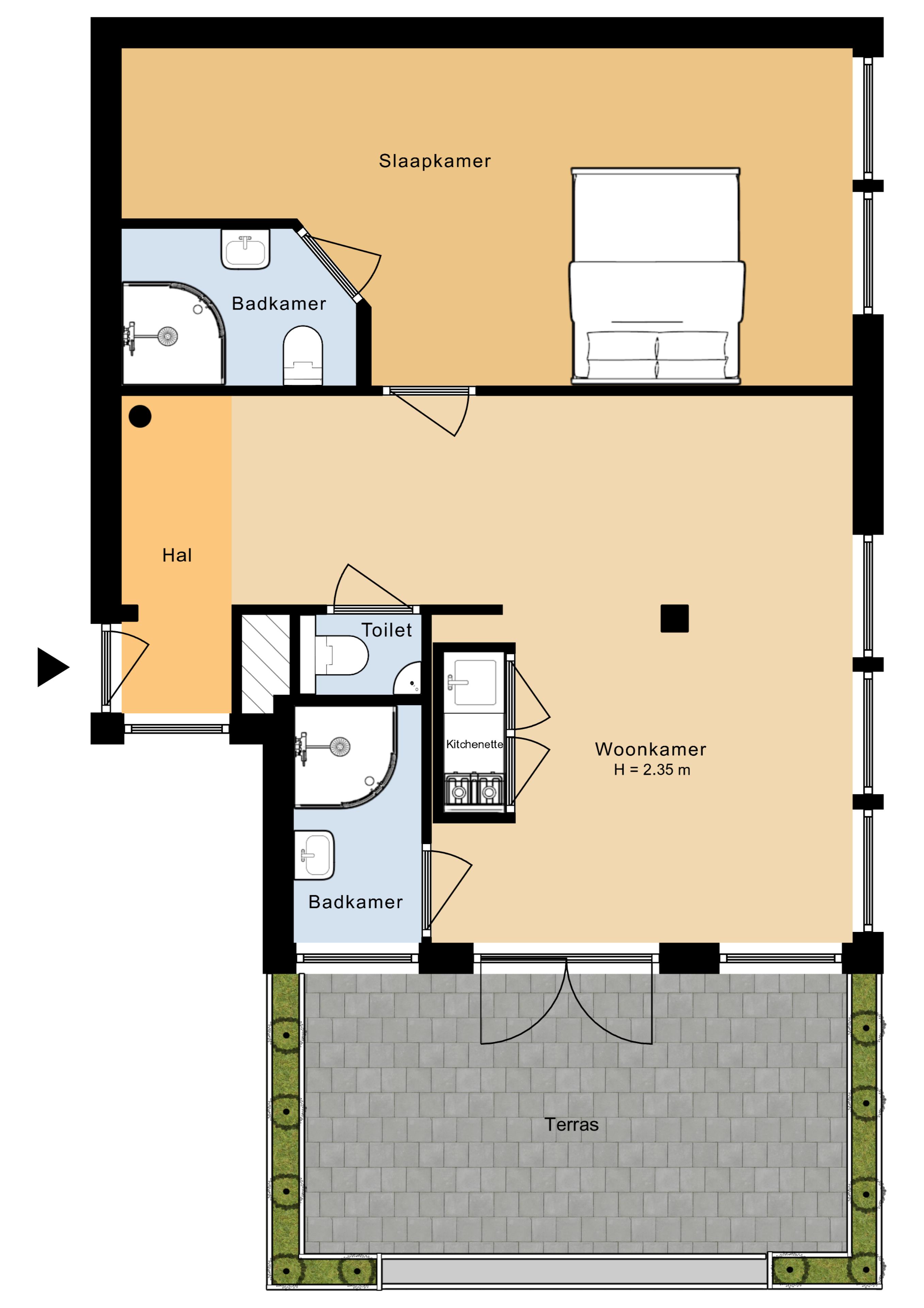 Het appartement heeft één slaapkamer met extra lange bedden (210 cm). Kom je met z?n vieren? Dan kun je de bank in de woonkamer uitklappen tot een comfortabele slaapbank. De badkamer is ensuite en voorzien van een ruime regendouche. Er zijn twee aparte toiletten in het appartement.