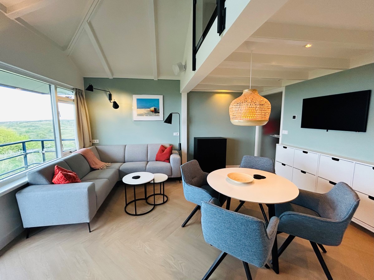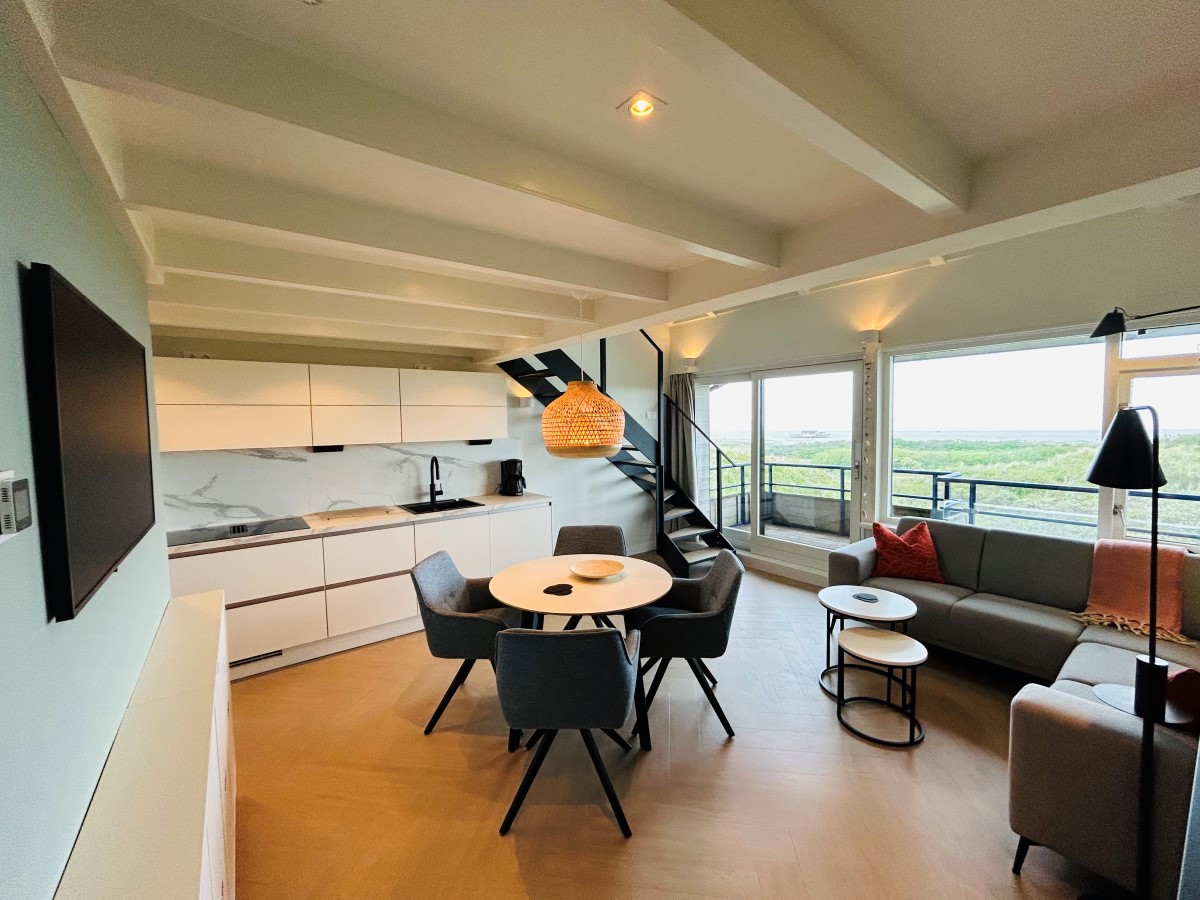 Bij binnenkomst betreedt u een hal die u leidt naar de lichte en gezellige woonkamer. Hier vindt u een open keuken en een comfortabele zithoek en eettafel. Het eerste wat uw aandacht zal trekken is het adembenemende uitzicht op de zee en de duinen, dat een fijn en ontspannen sfeer cre?ert. De open keuken is volledig uitgerust en biedt de perfecte gelegenheid om een heerlijke maaltijd te bereiden terwijl u van het prachtige uitzicht geniet.