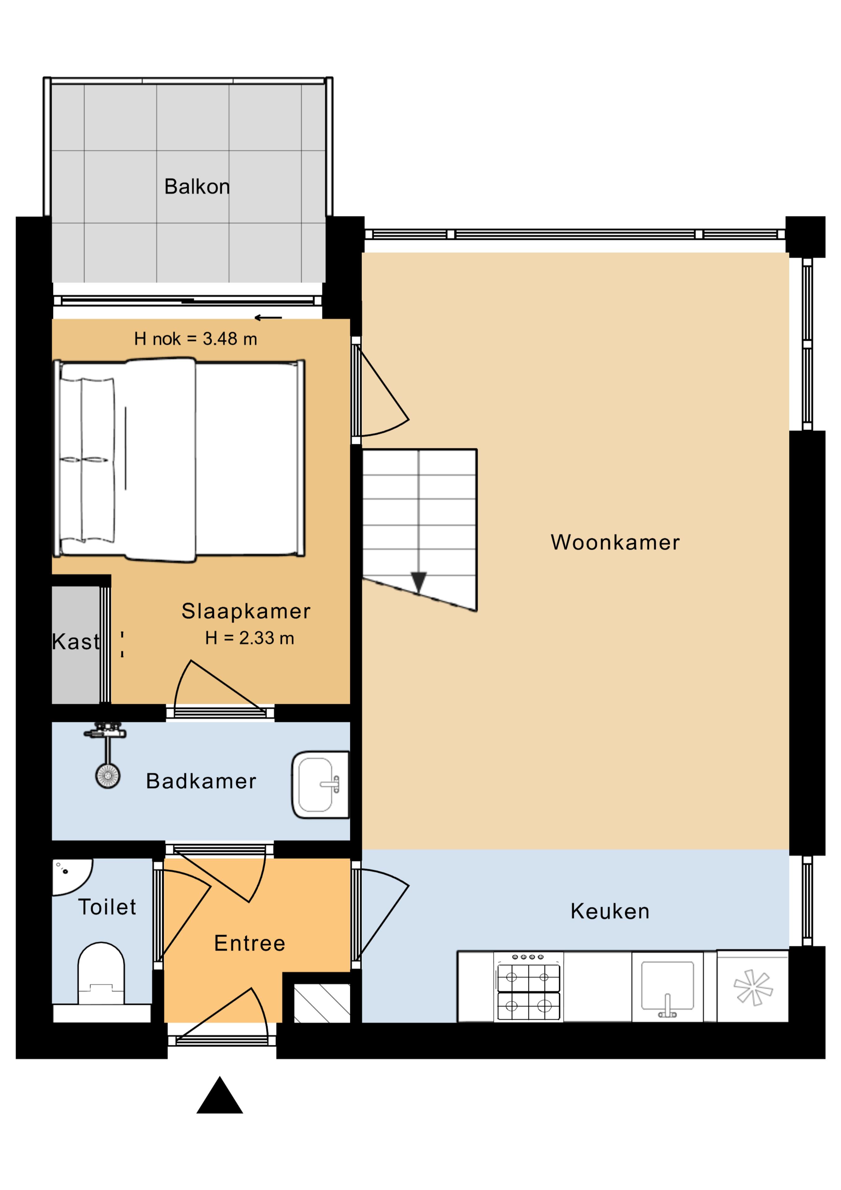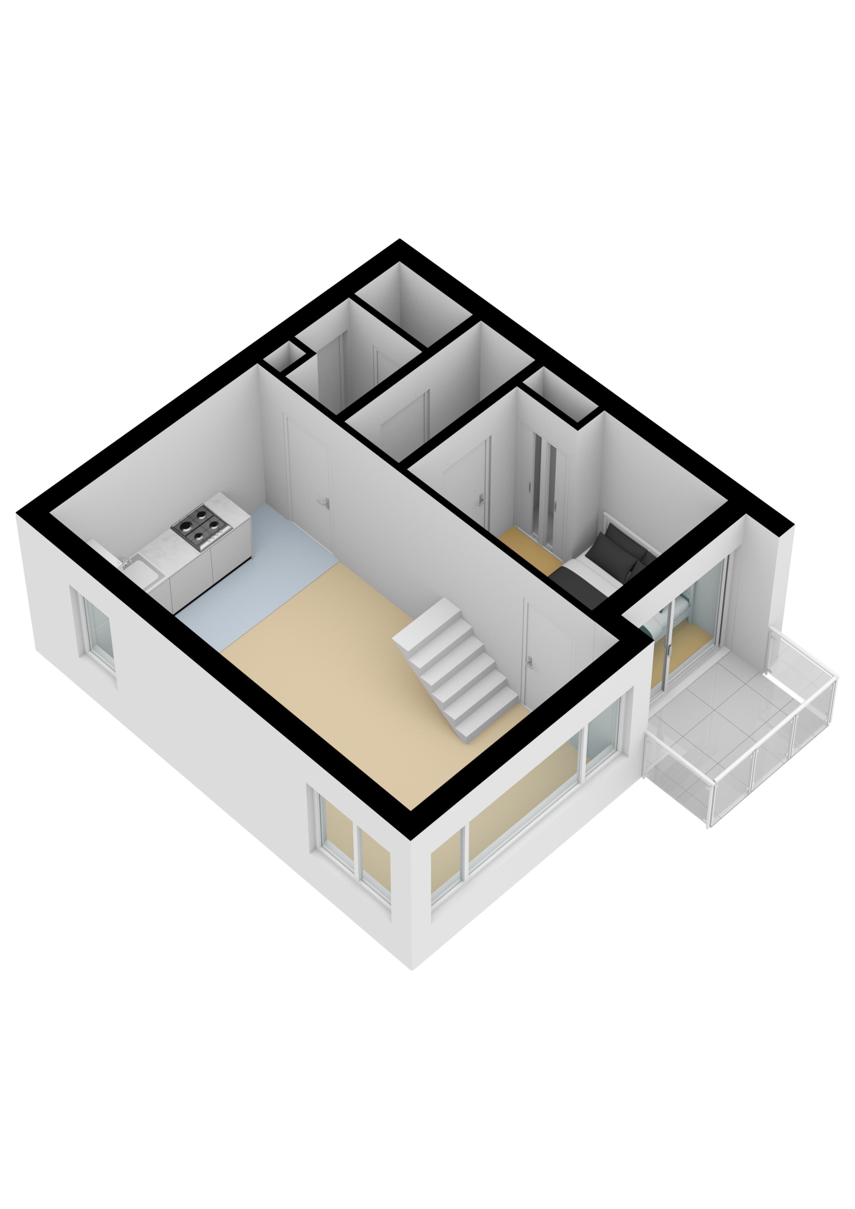 Das Wohnzimmer mit offener Küche hat eine gemütliche Atmosphäre. Das liegt auch an der Mezzanine, die ein behagliches Gefühl vermittelt. Ein Schlafzimmer grenzt an das Wohnzimmer, das andere geht auf die Mezzanine. Das Badezimmer hat ein Waschbecken und eine Dusche, die Toilette ist separat.