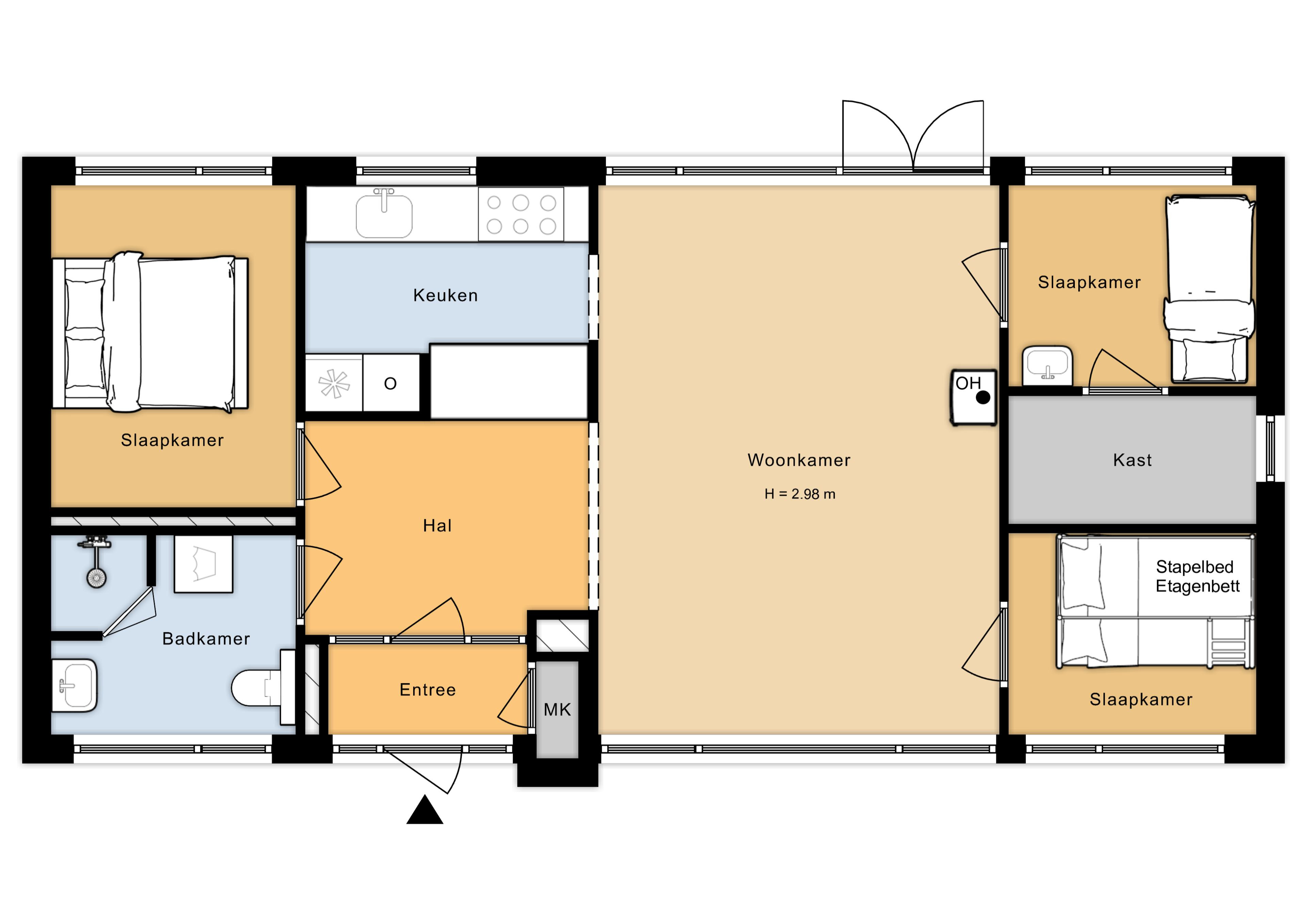 Bungalow Zuiderburen heeft 3 slaapkamers, waarvan eentje een eigen wastafel heeft. De badkamer en keuken zijn modern. De woonkamer is ruim en licht. De hele bungalow is voorzien van dubbel glas en plavuizen met vloerverwarming.